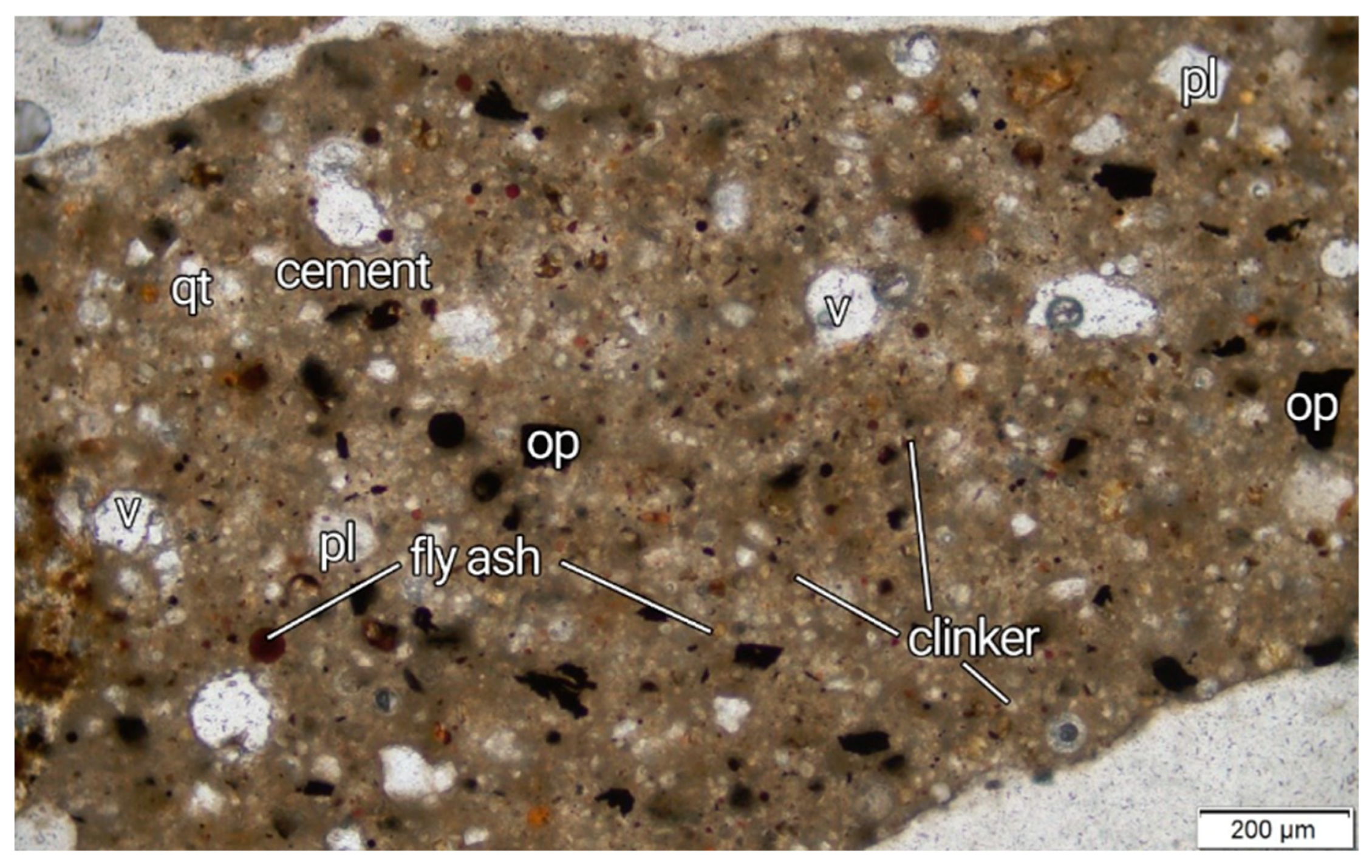 2), and opaque minerals bound together by a light brown cement paste. The cement phase has a clinker composition that includes alite (Ca