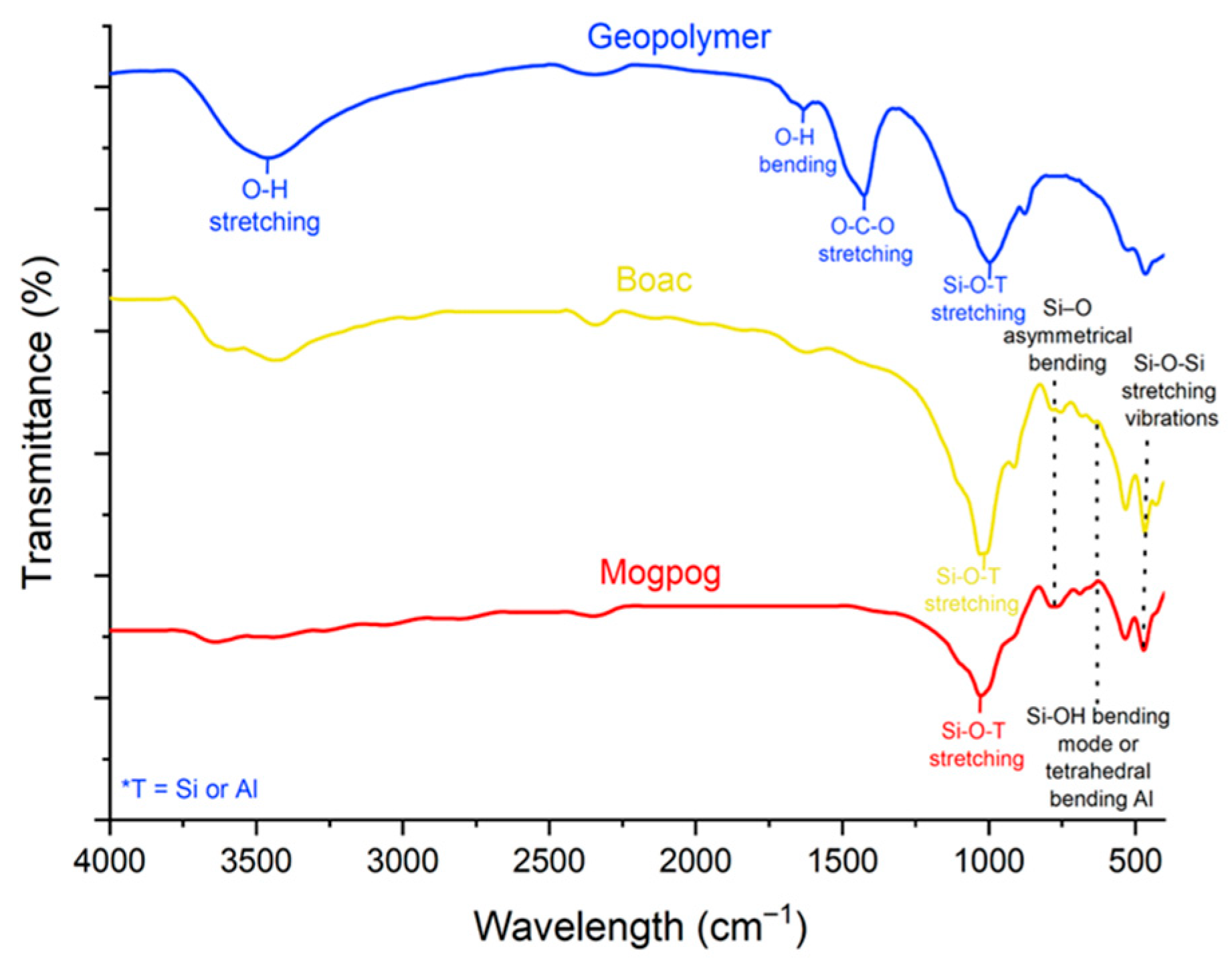 −1 was identified, attributed to the stretching vibration of O–H groups from water adsorbed by the hydrated compounds in the geopolymer matrix. This band was not observed in the MT samples from Mogpog and very limited, as they were thoroughly dried before characterization. Furthermore, a band at 1439 cm