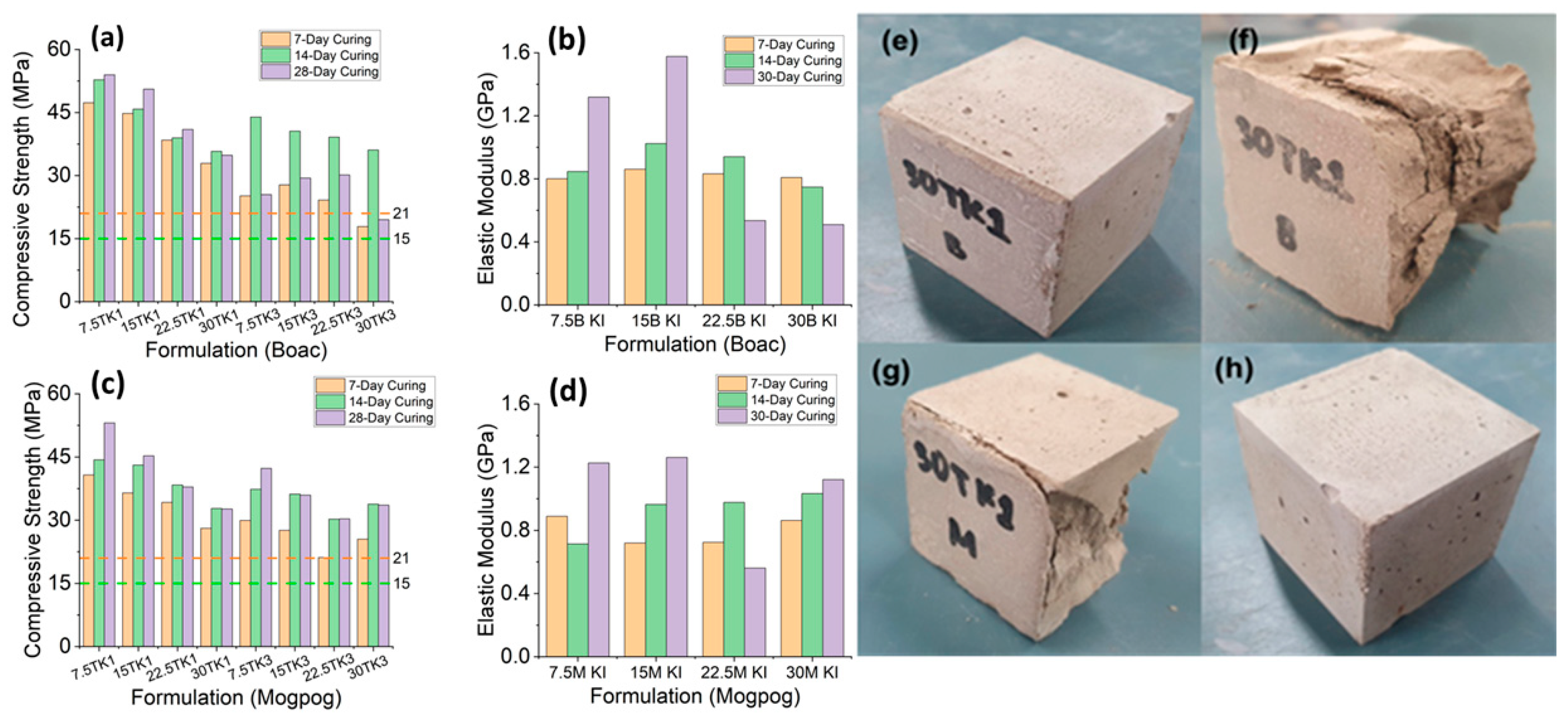 Figure 6 summarizes the variation in average compressive strength and elastic modulus, along with representative images of the hybrid geopolymer-cement mortar block before and after compressive testing. The green line indicates the minimum compressive strength requirement for cement mortars after 7 days of curing, as specified by ASTM C150, while the orange line represents the minimum requirement after 28 days of curing according to the same standard. The highest average compressive strength of 57.55 MPa was observed in hybrid geopolymer-cement samples containing 7.5% Mogpog sediments and activated with a 1 M KOH alkaline solution. Similarly, for Boac sediments, the highest compressive strength was 52.78 MPa. Although the compressive strengths of Mogpog-based samples were generally higher than those of Boac-based samples, the difference was not statistically significant.