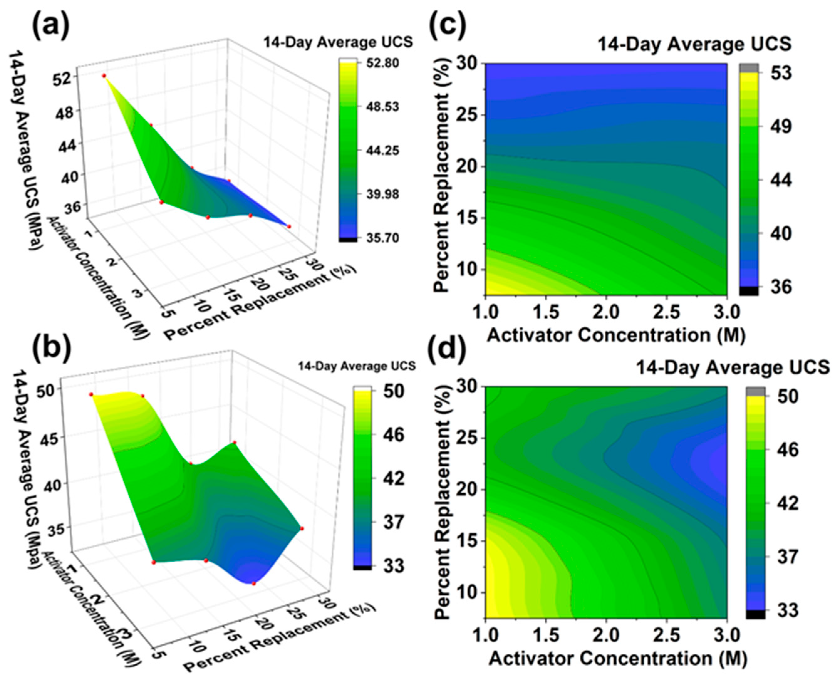 Figure 7 presents the response plot of compressive strengths for the Mogpog and Boac tailings-based briquettes after 14 days of curing, illustrating the relationship between activator concentration and the percentage of OPC replacement. For clarity, only the 14-day unconfined compressive strength (UCS) values are shown, as the general trend aligns with those observed after 28 days of curing. The plot reveals that compressive strength decreases as the percentage of OPC replaced with copper mine tailings increases, consistent with trends reported in the literature [