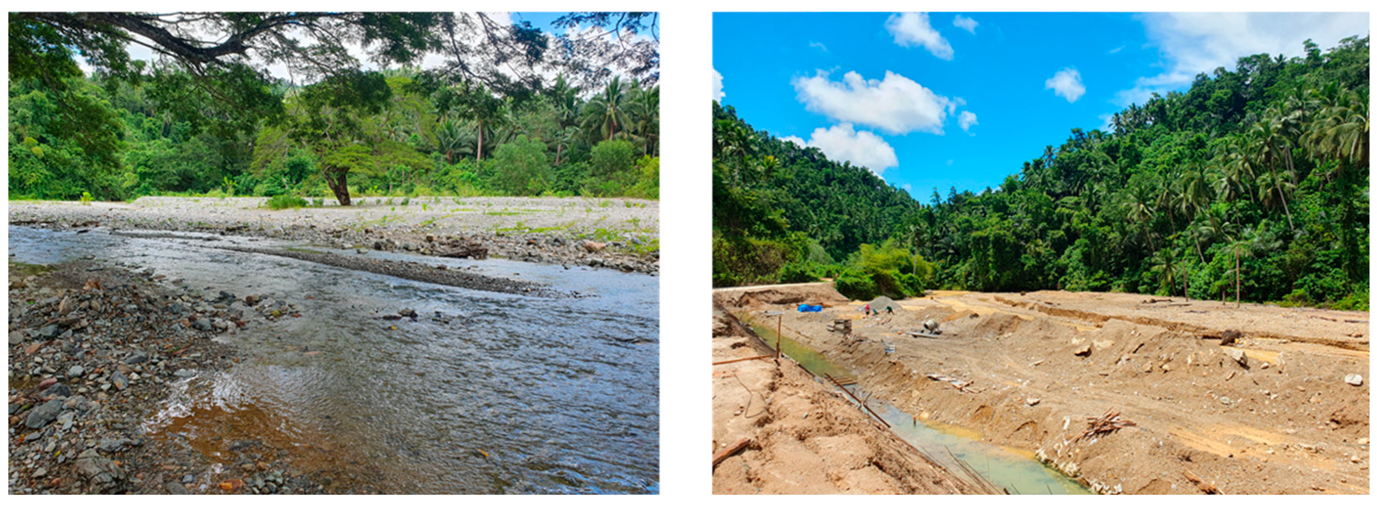 Figure 8. The sampling sites were selected to assess whether the sediment flow at the locations (upstream vs. midstream) affects the characteristics of the samples collected, and consequently, the resulting observations and experiments. These specific river sections were also specifically chosen due to their high siltation levels and the associated risks for flooding and groundwater contamination. Furthermore, these sites were selected based on their proximity to communities and upon recommendation of the local environment office. Sediment samples were collected by hand shovel from random locations within the riverbeds of the selected sampling sites.