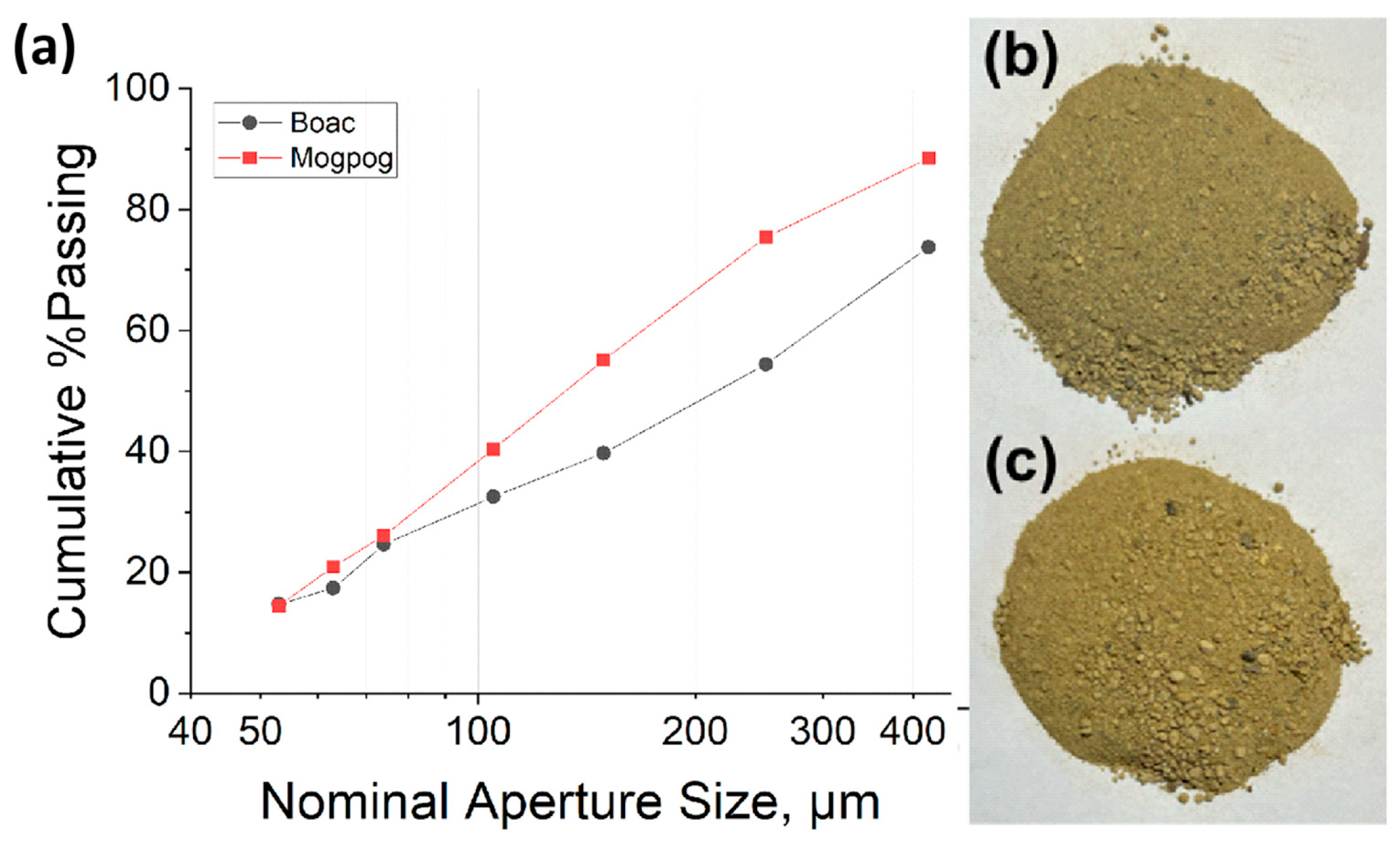Figure 10 shows the particle size distribution of the sediment samples obtained from two different sources along Mogpog and Boac River, Marinduque, Philippines. Based on the particle size distribution graph, the median particle size (d50) of the Mogpog sample is 167.57 µm, while the d50 for the Boac sample is higher at 220.24 µm. Similarly, the d80 values, representing the size below which 80% of the particles fall, were found to be 289.94 µm for Mogpog and 427.88 µm for Boac. The particle size distribution indicates that the collected sediment samples are fine, and that they can be suitable as fine aggregates for construction materials. Finer particles are favorable in such applications, as particle size strongly influences the early strength development of concrete [