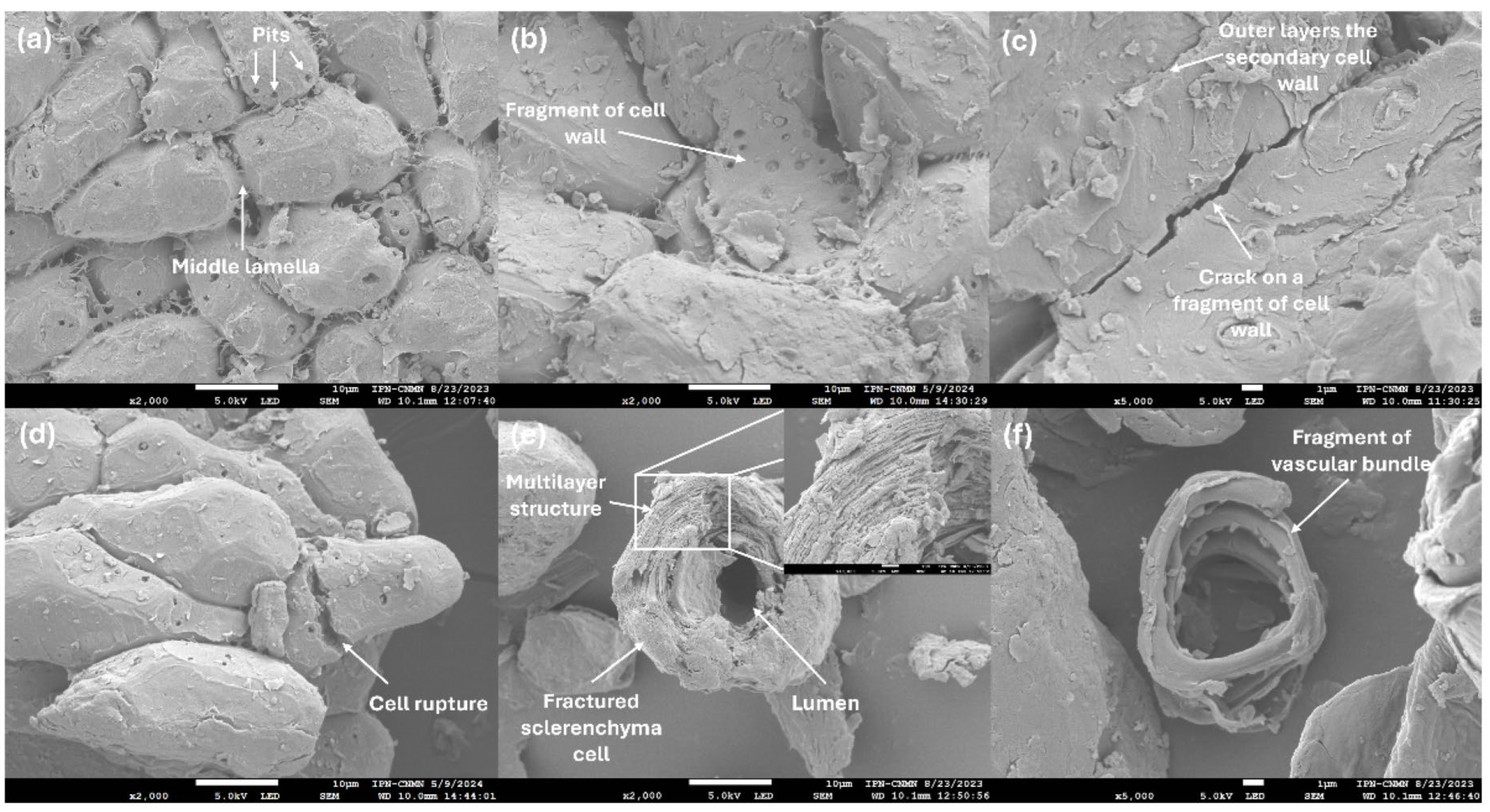 - Nicolás-Bermúdez, J.; Arzate-Vázquez, I.; Chanona-Pérez, J.J.; Méndez-Méndez, J.V.; Perea-Flores, M.J.; Rodríguez-Castro, G.A.; Domínguez-Fernández, R.N. Characterization of the Hierarchical Architecture and Micromechanical Properties of Walnut Shell (Juglans regia L.). J. Mech. Behav. Biomed. Mater. 2022, 130, 105190. [Google Scholar] [CrossRef]