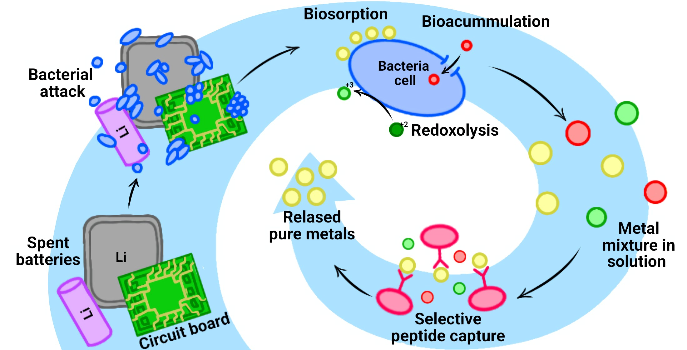 Martinez-Rodriguez, G.A.; Rojas-Contreras, J.A.; Vázquez-Ortega, P.G.; Reyes-Jáquez, D.; Medrano-Roldán, H.; Urtiz-Estrada, N.; Barraza-Salas, M.; Fierros-Romero, G.; Rodríguez-Andrade, E.; Zazueta-Álvarez, D.E. Biotechnological Strategies for the Recovery of Lithium and Other Metals from a Secondary Source: The Role of Microorganisms and Metal-Binding Peptides. Recycling 2026, 11, 4. https://doi.org/10.3390/recycling11010004