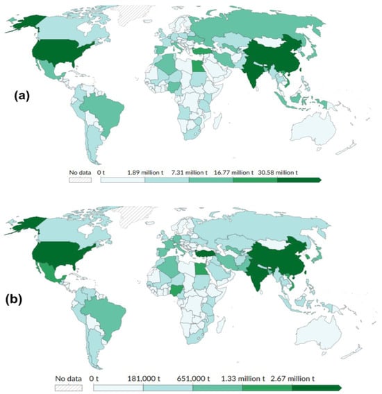 High-output countries such as China (619 Mt/y), India (145 Mt/y), and the United States of America (31.5 Mt/y) dominate global production and associated losses. Nations like Turkey and the USA exhibit particularly high loss-to-output ratios, suggesting challenges in storage, logistics, or market alignment [4]. It is important to note that Food and Agriculture Organization (FAO) statistics (Figure 1 and Figure 2) capture pre-consumer losses, whereas the UNEP Food Waste Index reports post-retail discards [4]. These datasets therefore represent different stages and intervention points [1].