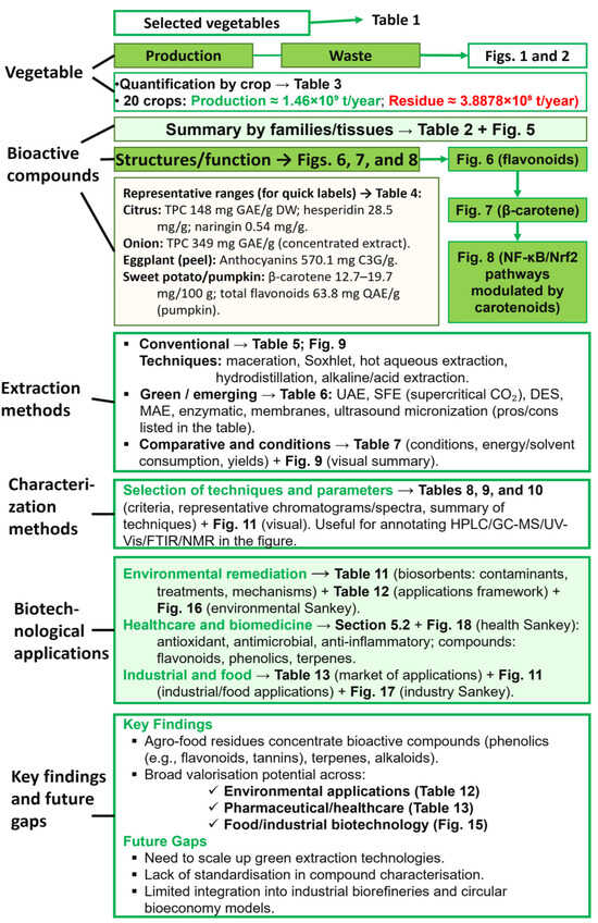 This review contributes to the valorization of plant-based waste through three core elements. First, it adopts a botanical and comparative perspective across twenty representative crops (nine fruits and eleven vegetables), detailing the qualitative and quantitative profiles of key BCs (phenolics, flavonoids, carotenoids, glucosinolates, sulfur compounds, alkaloids) and their anatomical distribution. Second, unlike most previous reviews that focus on single products or narrow residue types, such as citrus-processing wastes, fruit-juice by-products, cruciferous vegetables, potato or banana peels, watermelon rind, or extraction-method-centered analyses [7,8,9,10,11,12,13,14,15], this work integrates plant-by-plant and tissue-specific information. Finally, this level of resolution enables the identification of priority valorization streams (e.g., peels, seeds, stems, and pulp) for targeted applications in the food, biomedical, and environmental industries, providing an operational basis for bioprocess selection and scale-up, as discussed in later sections [16].