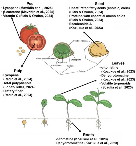 BCs are often concentrated in parts of the plant that are typically discarded during agricultural and food processing, such as peels, seeds, stalks, shells, and leaves. These “waste” tissues frequently contain significantly higher levels of phytochemicals than edible portions, making agro-food waste a rich and sustainable reservoir for functional molecules [18]. In addition to the fruit pulp, other tomato tissues, such as peel and seeds, are rich in BCs. While tomato peels can comprise three to four times more lycopene than the pulp, the seeds also contain phenolic acids and essential fatty acids, making both fractions valuable processing byproducts [28]. Citrus rinds, especially from oranges and lemons, are rich in essential oils (with d-limonene forming ~90% of orange peel oil) and flavanones such as hesperidin [18]. Potato skins, which represent only about 5% of the tuber by weight, may hold 50–100% of the tuber’s glycoalkaloid content; while the potato flesh may have less than 10 mg/kg, the peel can hold 90–400 mg/kg [29]. These examples (summarized in Table 2) highlight how common plant-based residues represent concentrated sources of bioactives with high valorization potential. The anatomical distribution of these bioactives in different tissues of Solanum lycopersicum is illustrated in Figure 5, highlighting key compounds found in the pulp, peel, seeds, leaves, and roots.