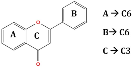 The chemical structure and functional groups directly influence the functionality of each class of BCs. Phenolic acids, for example, are characterized by one or more hydroxyl groups on an aromatic ring, which confer potent radical-scavenging ability by donating hydrogen atoms [48]. Flavonoids feature the standard C6–C3–C6 carbon skeleton (two benzene rings linked by a three-carbon bridge (Figure 6)), and their biological activity depends on the pattern of hydroxylation, methoxylation, and glycosylation on this backbone [49].