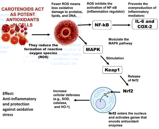 Inflammatory signaling pathways modulated by carotenoids, showing their inhibitory effect on NF-κB activation and their role in activating Nrf2-mediated antioxidant responses [54].