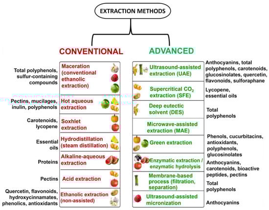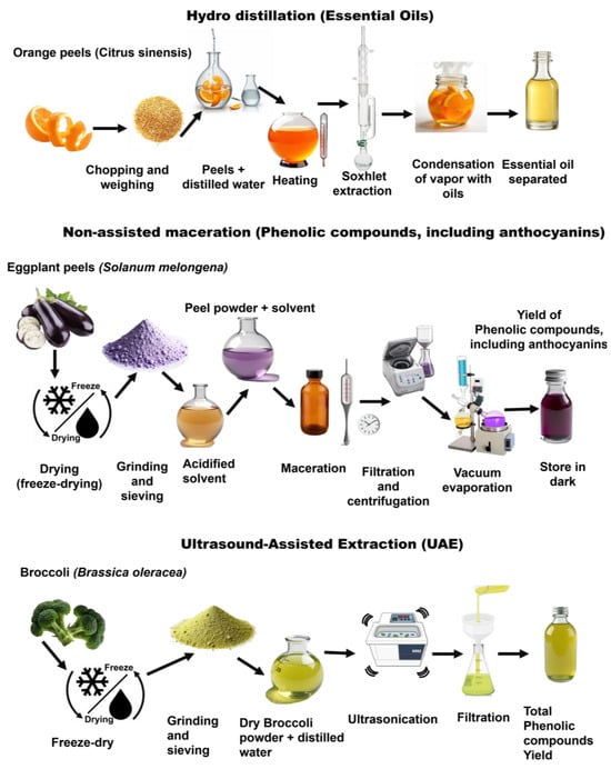 Bioactive compounds (BCs) are naturally occurring molecules present in plant matrices that exert beneficial physiological or functional effects in biological systems, including polyphenols, flavonoids, terpenes, glucosinolates, phenolic acids, alkaloids, and bioactive peptides, among others [5,12]. In the context of agro-food waste, these compounds are highly concentrated in by-products such as peels, seeds, leaves, stems, and residual pulps, making these materials strategic resources for obtaining functional ingredients and molecules of biotechnological interest [6,17]. Their relevance lies in their antioxidant, anti-inflammatory, antimicrobial, cytoprotective, and nutraceutical properties, which are widely documented in various waste streams such as citrus, solanaceae, cucurbits, alliums, and cruciferous crops [18,19,20].