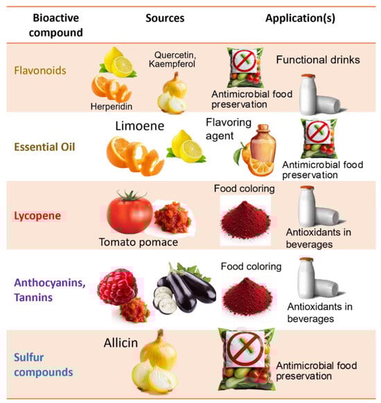Among these diverse compounds, phenolics (e.g., quercetin, resveratrol, and isoflavones), and carotenoids (e.g., β-carotene and lycopene) have attracted significant attention due to their antioxidant, anti-inflammatory, and nutraceutical potential. Capitalizing on such high-value molecules from waste streams aligns with circular economy principles while providing health-promoting ingredients for new products, which are discussed in the following sections.