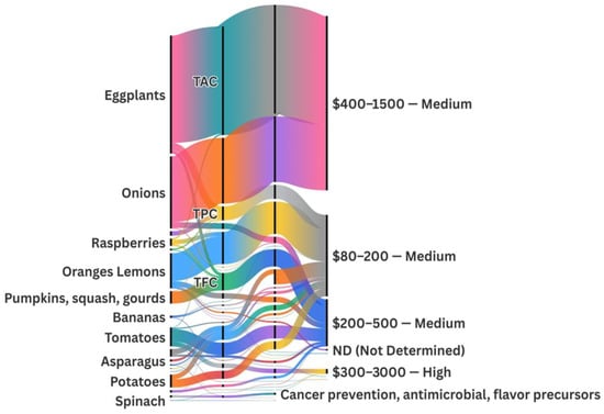 A remarkable variation in total phenolic content (TPC) is observed across taxa. Citrus fruits (oranges/lemons) show the highest phenolic content among the analyzed plant sources, with a TPC of 147.6 mg (gallic acid equivalent) GAE/g DW [72]. Onions follow closely with an exceptionally high TPC of 348.7 mg GAE/g, likely derived from a concentrated extract [73]. Sweet potato peels also stand out with 2.6 mg GAE/g DW [74], while carrots are one of the richest dietary sources of phenolics with 85.9 mg GAE/g DW [75].
