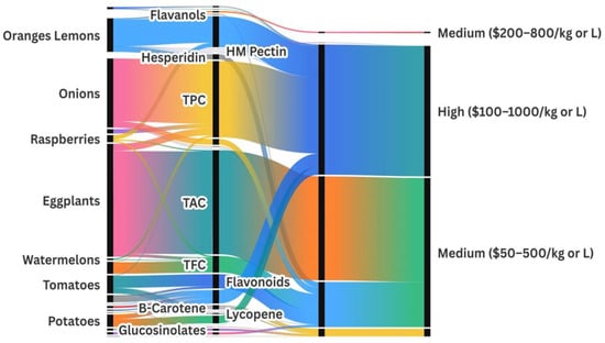By combining compound characterization with recovery strategies, this review also highlights valorization routes (multi-product process chains) and connects them with biotechnological, industrial, and environmental applications. These routes are supported by market and technical potential indicators presented in Section 5 and Section 6, as well as the Sankey diagram. This integrative structure helps translate academic findings into scalable process designs, bridging the gap between research and industrial implementation.