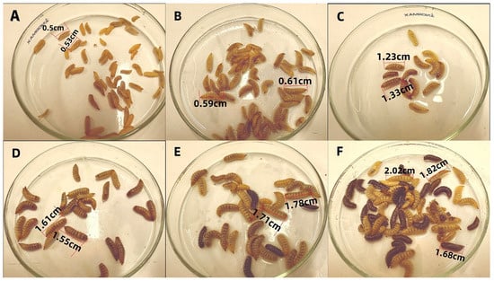Growth Status of BSFL. (A): 0 days old; (B): 3 days old; (C): 6 days old; (D): 9 days old; (E): 13 days old; (F): 15 days old.