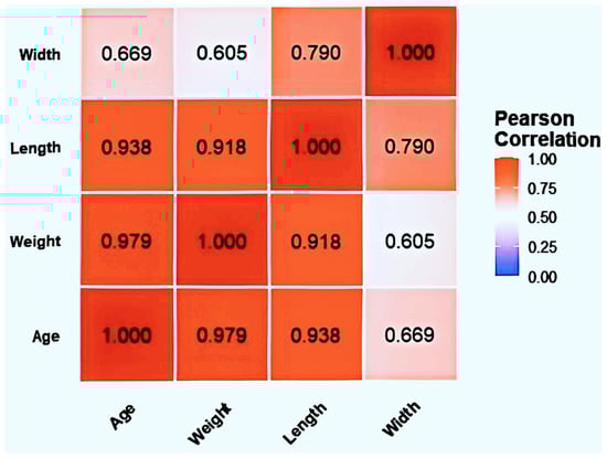 Correlation analysis (Figure 2) revealed significant correlations (p < 0.01) among all four variables: BSFL age, weight, body length, and body width. Age showed strong positive correlations with body weight (r = 0.979), body length (r = 0.938), and body width (r = 0.669). Body weight and body length exhibited a highly positive correlation (r = 0.918). A strong positive correlation also existed between body length and body width (r = 0.790). The detailed measurement data for body length, body width, and body weight are provided in the Supplementary Materials (Table S1).