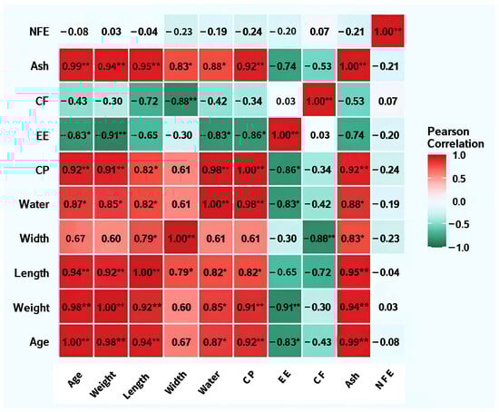 Correlation analysis (Figure 3) showed strong positive correlations (p < 0.01) between age and CP (r = 0.92), Ash (r = 0.99), and moisture (r = 0.87), and a significant negative correlation with EE (r = −0.83). Body weight and body length exhibited significant positive correlations with CP and Ash, and negative correlations with EE. CP and moisture showed a strong synergistic trend (r = 0.98), whereas CP and EE demonstrated a negative correlation (r = −0.86). Ash maintained significant positive correlations with nearly all nutritional parameters except NFE.