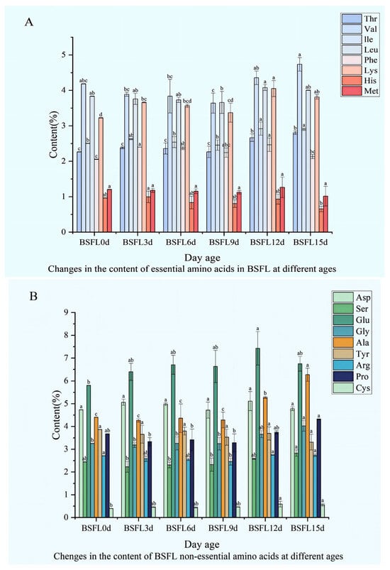 Dynamic changes in the amino acid composition of BSFL at different ages. (A) Essential amino acids; (B) Non-essential amino acids. Note: Thr: Threonine; Val: Valine; Leu: Leucine; Phe: Phenylalanine; Lys: Lysine; Met: Methionine; His: Histidine. Asp: Aspartic acid; Ser: Serine; Glu: Glutamic acid; Gly: Glycine; Ala: Alanine; Tyr: Tyrosine; Arg: Arginine; Pro: Proline; Cys: Cysteine. The lowercase letters (a, b, c) denote significant differences among groups; bars sharing the same letter are not significantly different (p < 0.05).