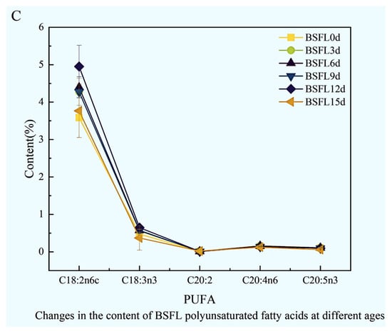 Dynamic changes in the fatty acid composition of BSFL at different ages. (A): Saturated fatty acids (SFA); (B): Monounsaturated fatty acids (MUFA); (C): Polyunsaturated fatty acids (PUFA).
