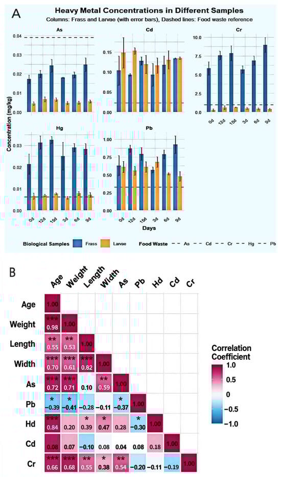 Heavy Metal Accumulation in BSFL and Frass under Food Waste Substrate (A):Study on the Distribution Dynamics of Heavy Metals in BSFL Feces and Insect Bodies Under food waste Substrate Conditions; (B): Heatmap of correlation matrix between body length, body weight, body width of BSFL at different ages and heavy metal content in BSFL; (C): Heatmap of correlation matrix between body length, body weight, body width of BSFL at different ages and heavy metals in BSFL faeces). Note: As: Arsenic; Pb: Lead; Hg: Mercury; Cd: Cadmium; Cr: Chromium. Statistical significance levels are indicated as: * p < 0.05, ** p < 0.01, *** p < 0.001.