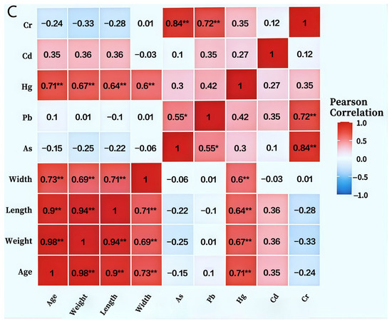 Pearson correlation analysis revealed (Figure 7C) significant positive correlations (p < 0.01) between BSFL body length, body width, body weight, and age. Body weight showed the highest correlation with age (r = 0.98), followed by body length with body weight (r = 0.94). Among heavy metals, As and Pb showed a significant positive correlation (r = 0.55, p < 0.05), while As and Cr exhibited extremely significant positive correlations (r = 0.84), as did Pb and Cr (r = 0.72, p < 0.01). Notably, Hg showed highly significant positive correlations with all larval growth indices (age, weight, body length, body width) (r = 0.60–0.71, p < 0.01). In contrast, Cd showed no significant correlations with any of these indices. Furthermore, As exhibited negative correlations with all growth indices, though these relationships did not reach statistical significance.