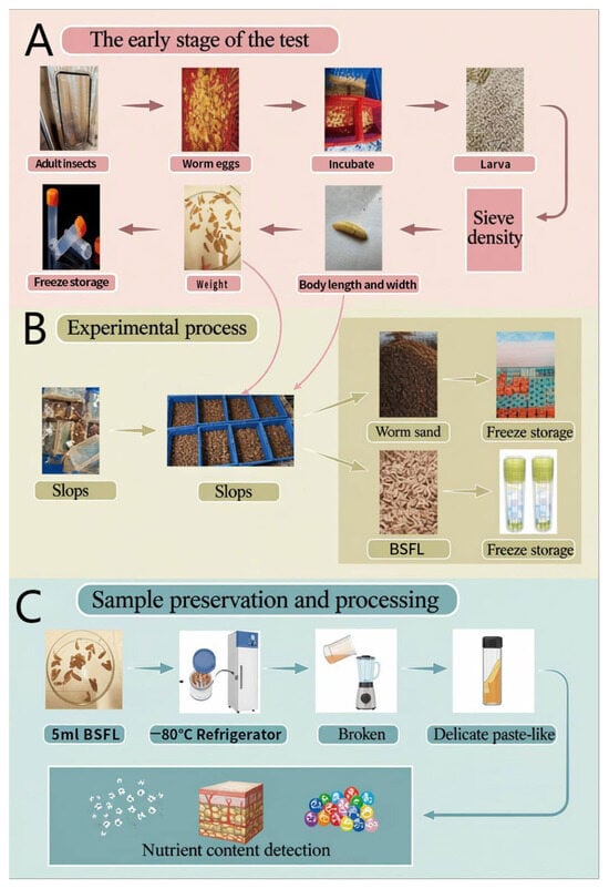 However, a comprehensive understanding of key BSFL adaptation mechanisms is still evolving. Specifically, how their growth dynamics, nutrient accumulation, and heavy metal distribution patterns respond to variable rearing substrates requires further elucidation. This knowledge gap persists because much current research is narrowly focused on isolated life stages or basic nutritional endpoints [16,17], leaving a significant gap in system-level, life-cycle analyses. This includes a lack of detailed information on developmental progression across all larval stages, shifts in specific amino acid and fatty acid profiles, mineral accumulation trends, and the transfer dynamics of heavy metals within the integrated “larva–frass” system [18]. Crucially, the ecological adaptation strategies and resource conversion efficiency of BSFL confronted with high-moisture, low-protein, and strongly acidic (pH ≈ 3.62) food waste—a common yet under-investigated scenario—remain largely unexplored.