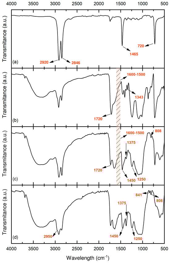FTIR-ATR spectra of: (a) Fragment 2, representative of recycled HDPEw; (b) Fragment 16, (c) Fragment 19, and (d) Fragment 21.