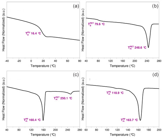 In contrast, fragments 16 (Figure 2b), 19 (Figure 2c), and 21 (Figure 2d) exhibited spectral features consistent with non-polyethylene polymers. Fragments 16 and 19 showed a pronounced carbonyl (C=O) stretching peak at approximately 1720 cm−1, a characteristic and intense band of PET. Particularly in fragment 19, this carbonyl peak partially overlapped with adjacent absorption bands but remained clearly identifiable. Additional PET-specific peaks were observed around 1250 cm−1, corresponding to the ester group (O=C–O–CH2) torsion, and the 1600–1500 cm−1 region, associated with aromatic ring vibrations [25]. This fragment as well as the 21 (Figure 2d) contain polypropylene (PP), evidenced by the typical methyl (–CH3) bending vibrations between 1450 and 1375 cm−1, along with peaks at 2950 cm−1 (–CH3 asymmetric stretching), 841 cm−1 (out-of-plane CH bending), and 808 cm−1 (C–C skeletal stretching), which clearly differentiate PP from HDPE [24]. Fragment 14 presented a more complex case. Its FTIR spectrum showed overlapping features of PU and PET; consequently, the polymer type cannot be accurately identified by FTIR [26]. In this regard, DSC analysis was performed on all fragments to identify the polymeric material of fragment 14 and to corroborate the FTIR-ATR results. The obtained thermograms are shown in Figure 3, along with the characteristic temperatures for each fragment.