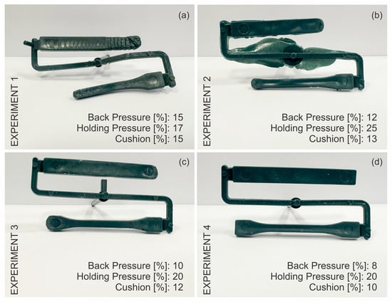 Sequential adjustment of injection-molding parameters to optimize the processing of recycled HDPEw: (a) initial conditions (Experiment 1), (b) modified back and holding pressures (Experiment 2), (c) refined settings to improve flow (Experiment 3), and (d) final optimized conditions yielding complete mold filling (Experiment 4).