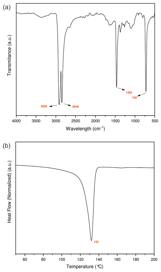 (a) ATR-FTIR spectrum showing the characteristic absorption bands of polyethylene and (b) DSC thermogram displaying the melting behavior of injection-molded specimens produced from recycled HDPEw.