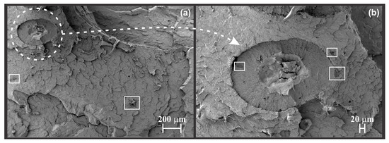 FESEM images of recycled HDPEw: (a) low-magnification (55×) view evidencing the presence of unmelted domains and (b) higher-magnification (150×) amplified view of the big domain with more minor inclusions. The white dotted circle in (a) indicates a circular domain with different fracture behavior, magnified in (b). The white square in (a) highlights smaller domains showing poor interfacial adhesion.