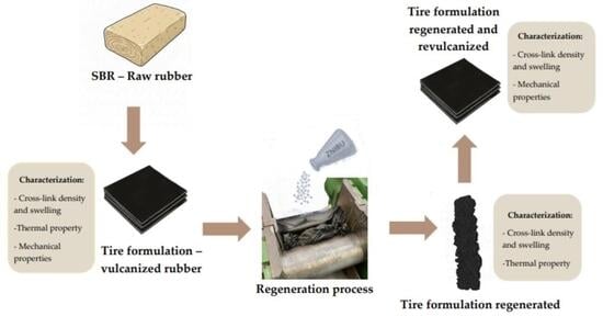 - Neto, J.R.A.; Visconte, L.L.Y.; Tavares, M.I.B.; Pacheco, E.B.A.V.P.; Furtado, C.R.G. Regeneration of vulcanized compounds based on butadiene-styrene copolymer. Int. J. Polym. Mater. 2007, 56, 575–587. [Google Scholar] [CrossRef]