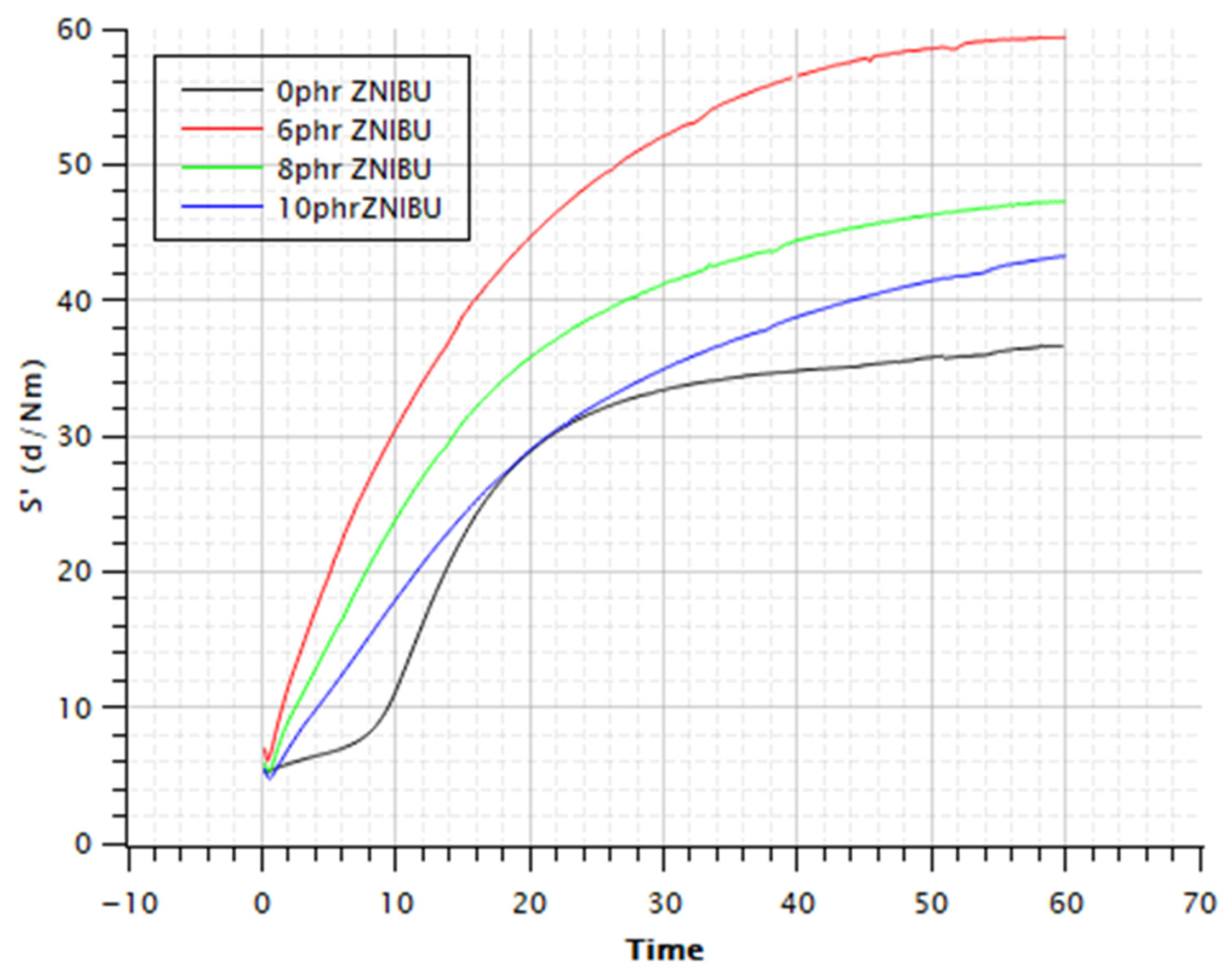 | ZNIBU Concentration (phr) | Hardness (Shore A) | Tear Strength (N/mm) | Rupture Stress (MPa) | Elongation at Break (%) |