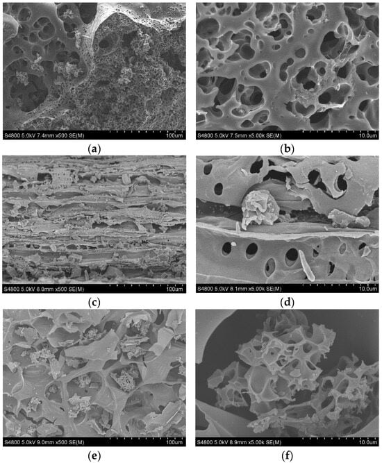 SEM images of ABC-1S (a,b), ABC-2S (c,d) and AHTC (e,f).