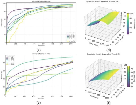 Removal efficiency f and the RSM quadratic model for: ABC-1S (a,b), ABC-2S (c,d) and AHTC (e,f).