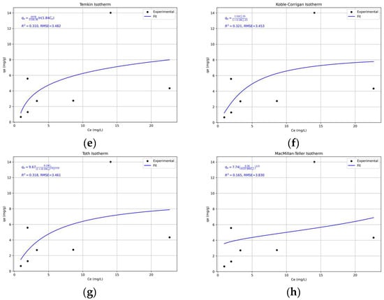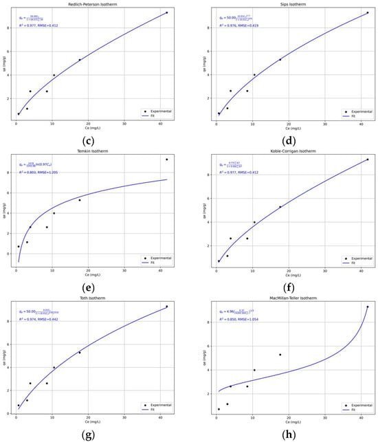 The adsorption data show different mechanisms for MB across the three materials. For ABC-2S (Figure 9), the highest fits (R2 ≈ 0.977, lowest RMSE ≈ 0.41) with Freundlich, Figure 9b, Redlich–Peterson, Figure 9c, and Koble–Corrigan, Figure 9f, models are indicative of adsorption on a heterogeneous surface with multilayer and variable energy sites. This finding aligns with recent research that complex isotherm models provide a more accurate description of MB uptake on highly porous and functionally heterogeneous activated carbons (e.g., mesopore-dominant ABCs with superior MB binding) [59]. Conversely, ABC-1S (Figure 10) demonstrates only moderate fits across all models (R2 ≈ 0.75), indicating a diminished overall equilibrium affinity and less significant surface heterogeneity, aligning with research indicating that reduced activation development results in inferior adherence to classical isotherms for MB adsorption (e.g., lower R2 and RMSE patterns in base-modified chars) [54].