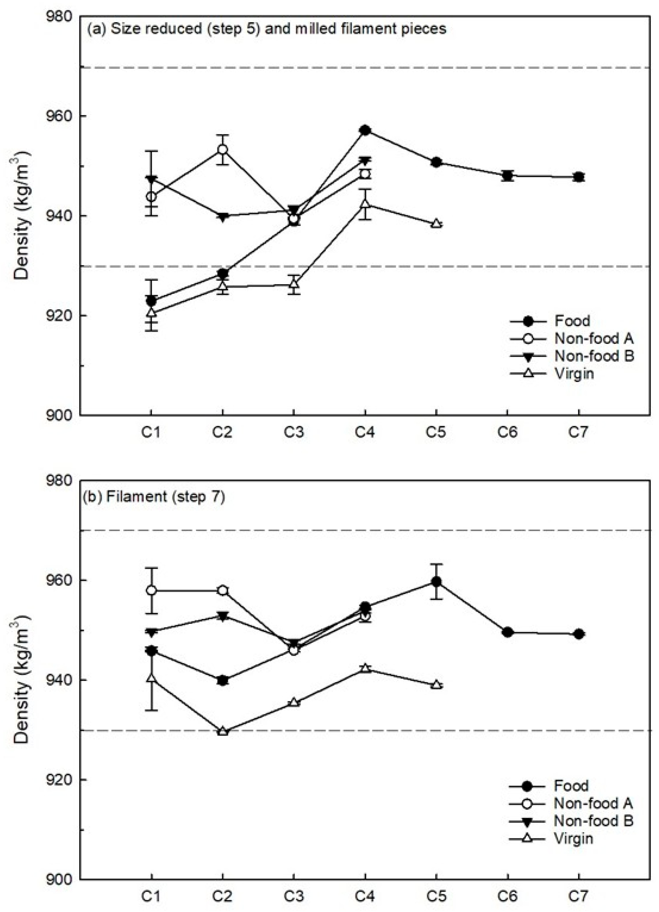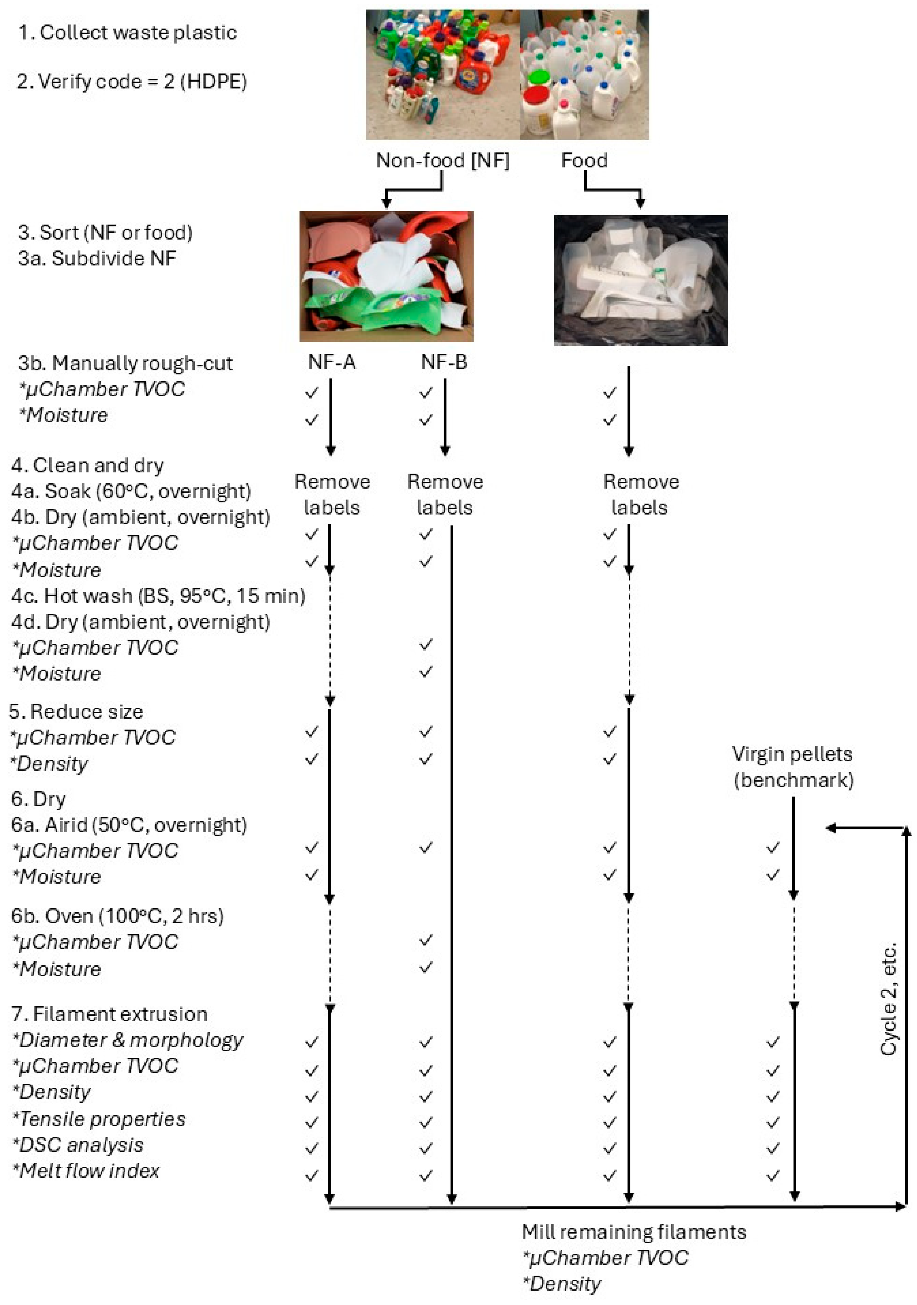 - Post-consumer waste HDPE plastic from rigid food and non-food packaging and a virgin HDPE resin (benchmark material) were granulated and extruded into filament and the process repeated 4 to 7 times.