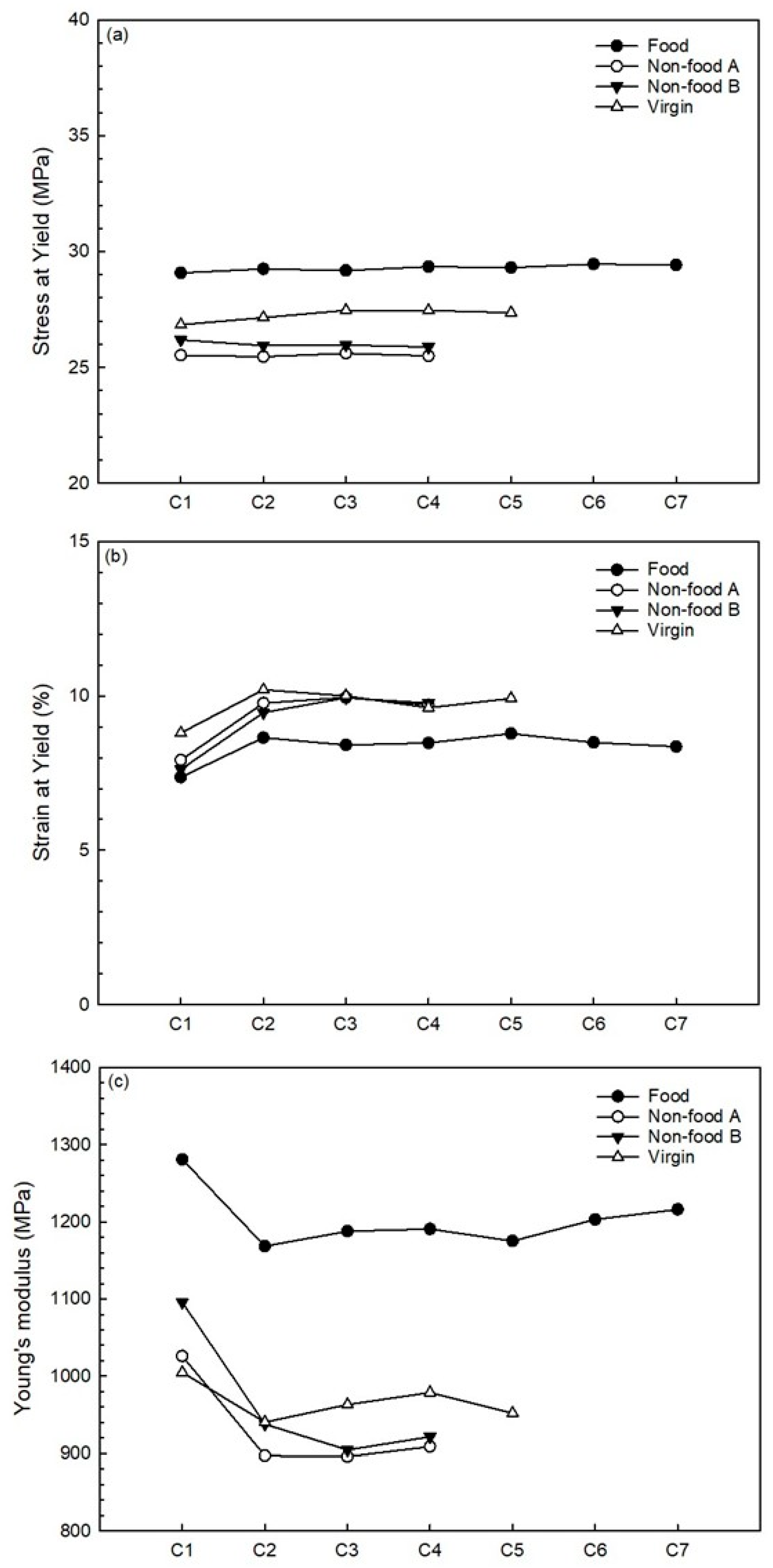 - The mechanical, processability, and thermal properties of the plastic streams were largely unaffected; i.e., Young’s modulus decreased by 5 to 16%, MFI was relatively stable at 0.2 to 0.7 g/10 min for waste plastics, and crystallinity ranged from a 6% decrease to a 9% increase.