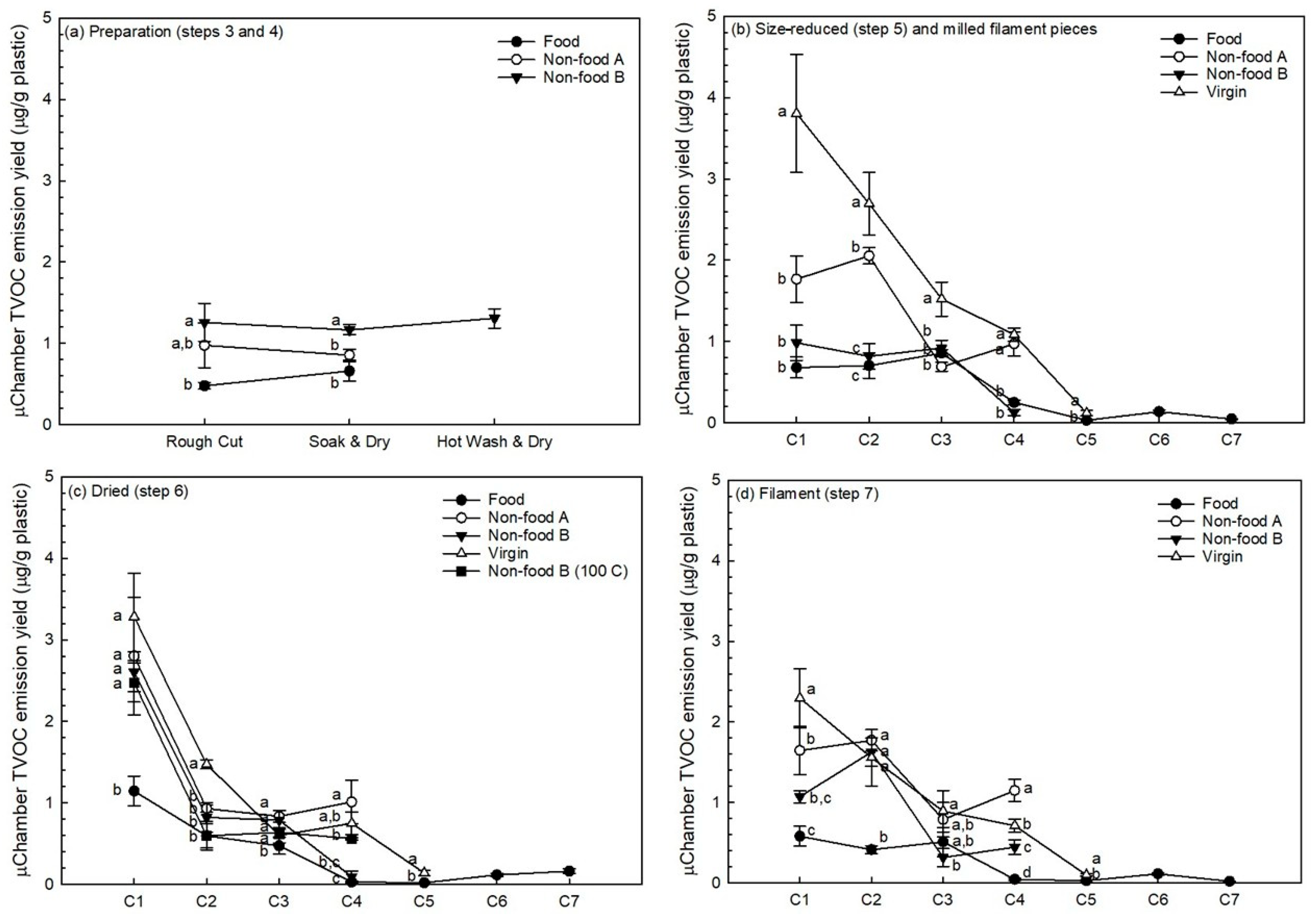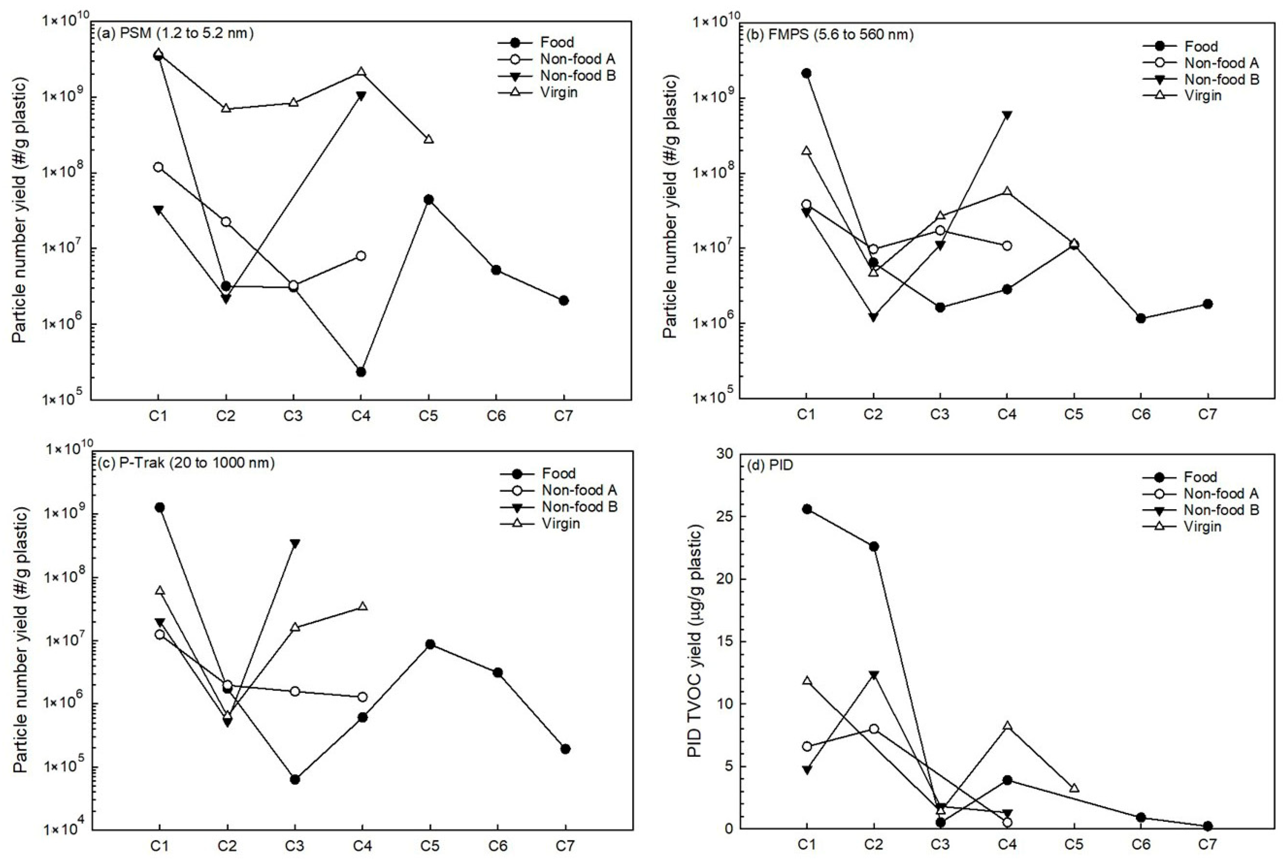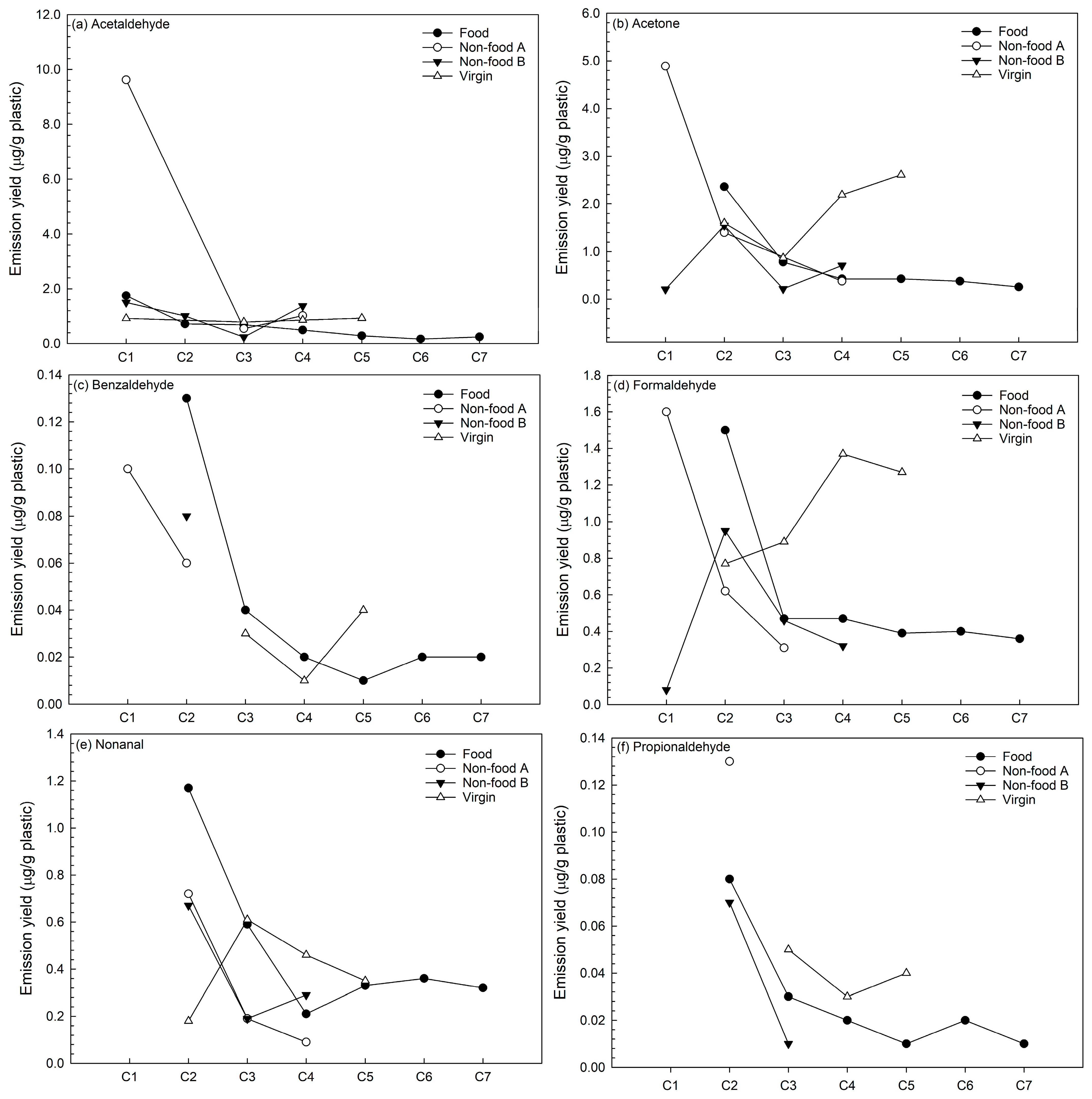 - Emission yields for some, but not all, aldehydes tended to be lower for the food stream plastic compared with the other streams.