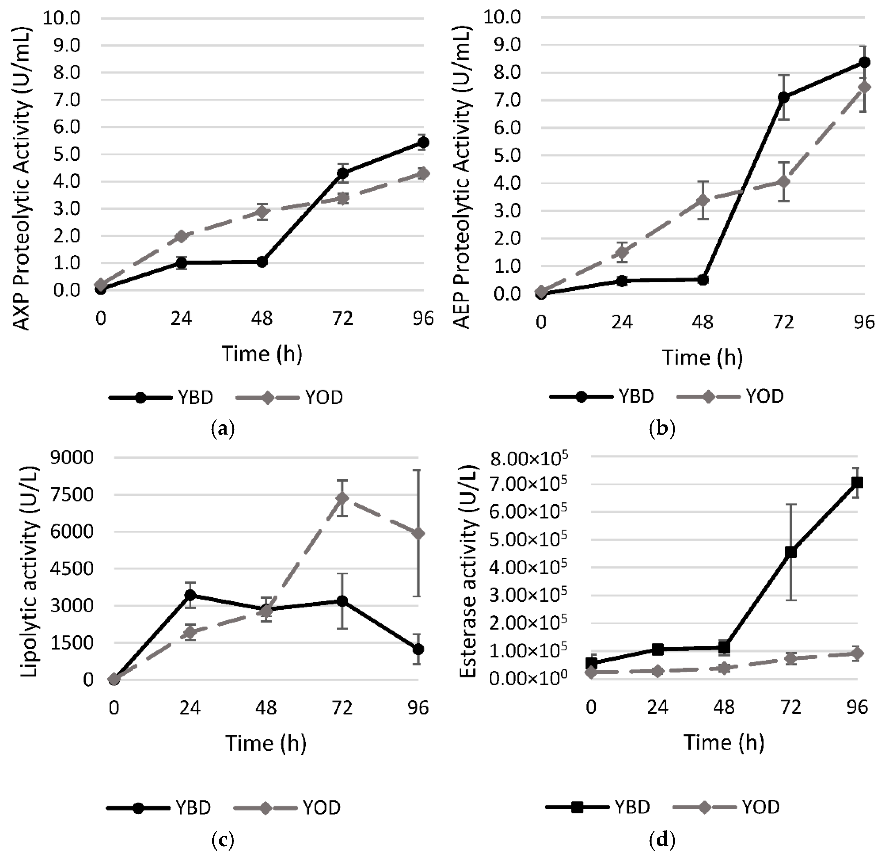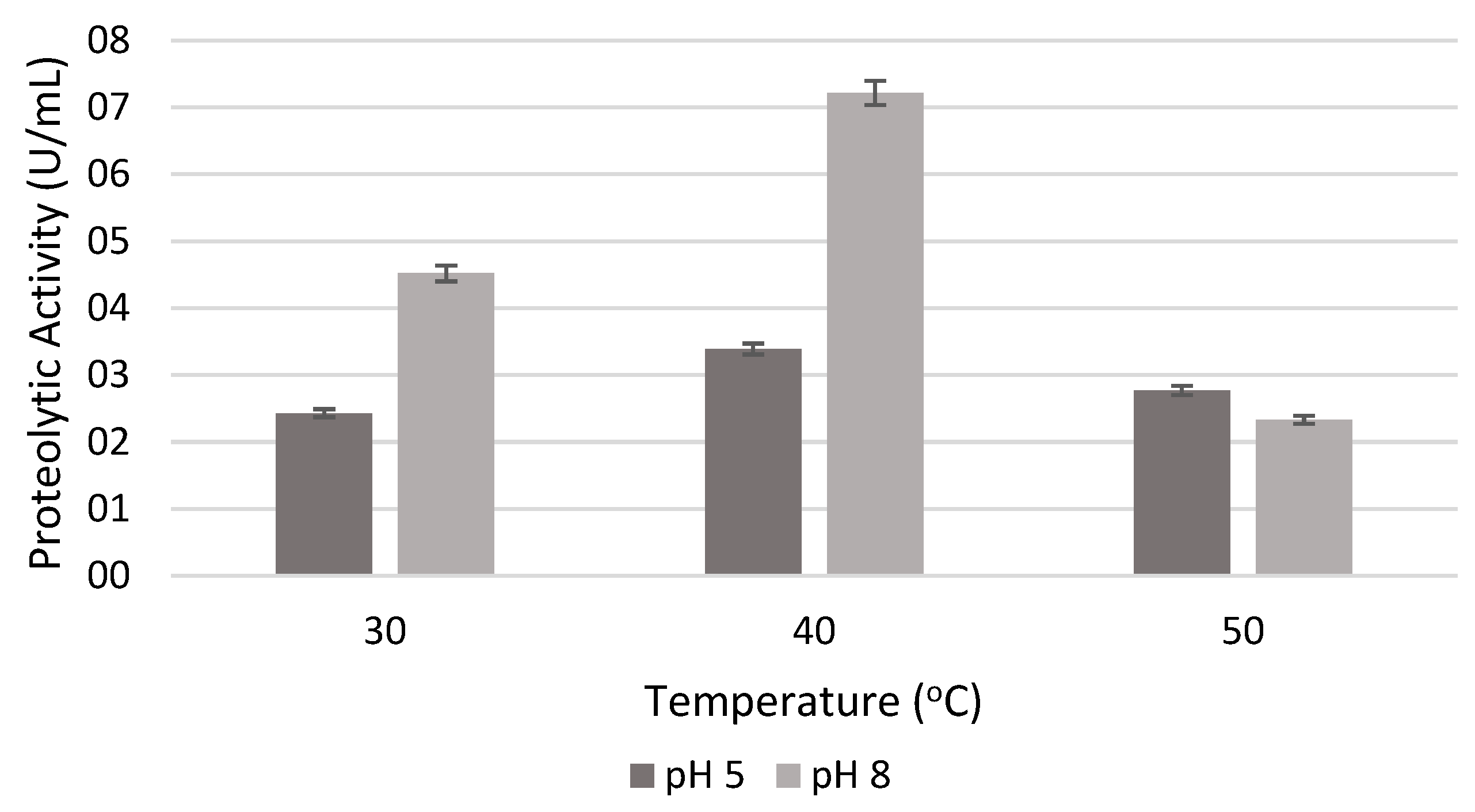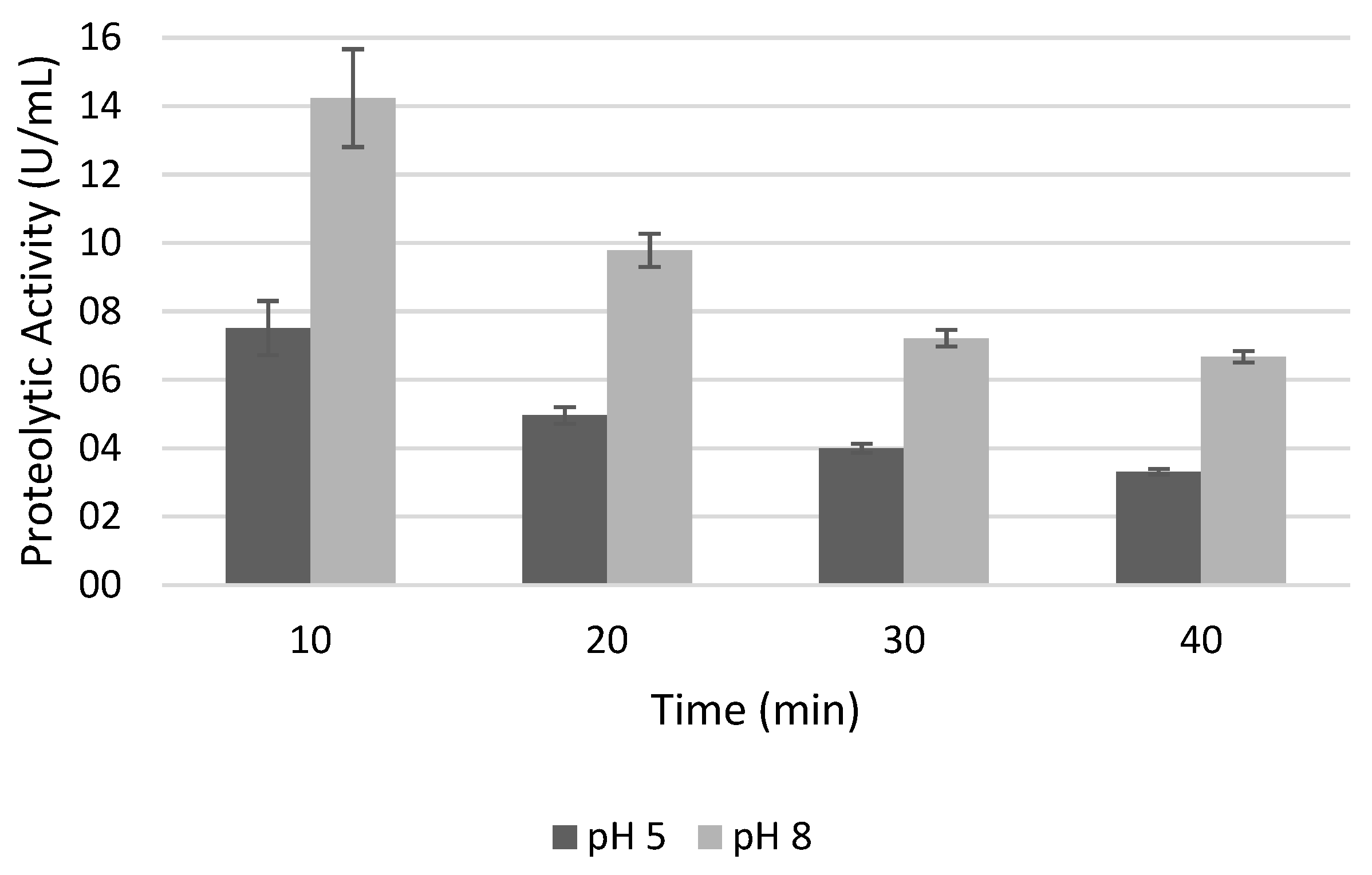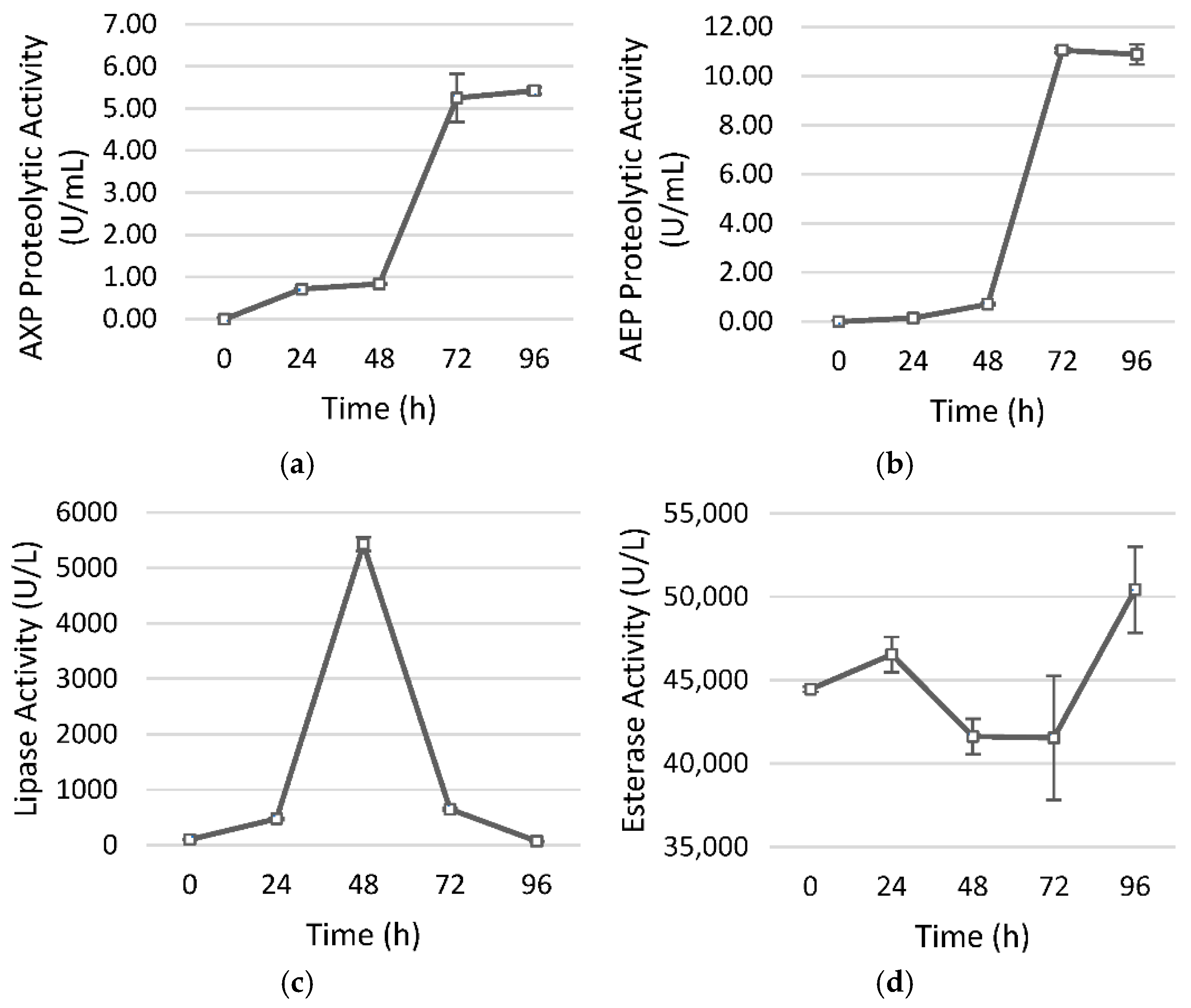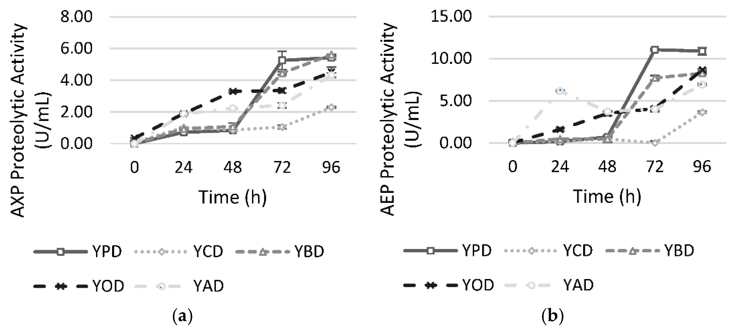 - Hernández-Martínez, R.; Cordova, J.; Barbosa, A.; Rico-Martínez, R.; Cruz-Guerrero, A. Purification and characterization of a thermostable alkaline protease produced by Yarrowia lipolytica. Rev. Mex. De Ing. Química 2011, 10, 333–341. Available online: http://www.scielo.org.mx/scielo.php?script=sci_arttext&pid=S1665-27382011000200017&lng=es&nrm=iso (accessed on 25 September 2025).