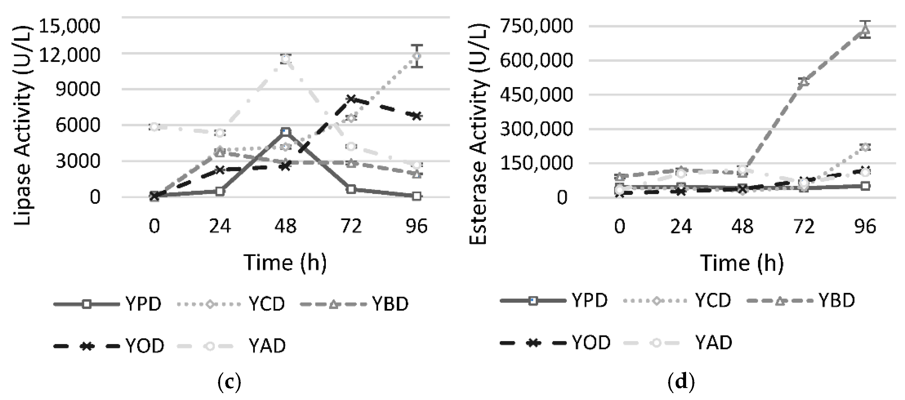 - Brigida, I.; Amaral, P.F.; Gonçalves, L.R.; Rocha-Leão, M.H.; Coelho, M.A. Yarrowia lipolytica IMUFRJ 50682: Lipase Production in a Multiphase Bioreactor. Curr. Biochem. Eng. 2014, 1, 65–74. [Google Scholar] [CrossRef]