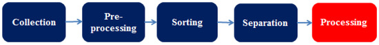 Figure 3 provides a CRT processing flow chart. E-waste recycling comprises four main steps: collection, pre-processing, sorting, separation, and processing. The first stage of recycling is collection from consumers once the EEE have reached their EOL.