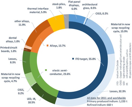 Indium is one of the strategically important materials that have been characterized as critical by several industrialized countries [1,2,3,4]. Up until 2025, the yearly demand for this material is estimated to grow by 70% relative to the year 2015 [5]. In 2011, 1220 t indium was primarily mined worldwide, from which 660 t indium was refined [5]. In recent years, the output of refined indium increased to 800 t in 2013 and 820 t in 2014 [6]. Over 55% of the worldwide production of indium is used in the ITO (indium tin oxide) target industry, which is a major component in the production of liquid crystal displays (LCD) [5,6,7,8] (cf. Figure 1). For further information about the use of indium see the text in the Supporting Information S1.