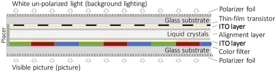Design of liquid crystal displays (LCD) panels with indium tin oxide (ITO) layers and polarizer foils in profile.