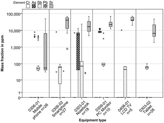 Mass fractions of toxic heavy metals + Sr in the LCD glass of various LCD devices in ppm depicted as boxplot with median, interquartile range (IQR) (25%/75%), and whiskers of 1.5 IQR (circle: outlier >1.5 IQR, asterisk: extreme value >7 IQR).