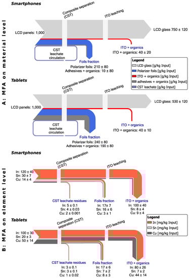 The newly developed recycling approach consists of a composite separation test (CST) and dissolution of the ITO from the glass substrate conducted on samples taken from smartphones and tablets. For both steps, a mass flow analysis was carried out, depicted on a material level in a percentage and on an element level as mg/kg input material in order to assess the quality of the generated output fractions. Figure 7 shows the results.