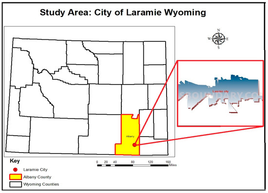 Laramie is a growing city, located in Southeastern Wyoming, USA, (Figure 1) with a population of 32,081 in 2014 [34]. It is home to the University of Wyoming and serves as an access point to many outdoor recreation areas, including the Snowy Range, the Medicine Bow-Rout National Forests, and Vedawoo. People enjoy participating in recreation activities, and consequently tend to care about preserving the environment. In addition, the city has one of the highest employment rates in the state, with a majority of people working in the academic sector [35]. Residents of Laramie tend to have high levels of education and are likely to respond favorably towards environmental protection. This was also evidenced in a recently conducted public forum, in which a significant number of Laramie residents complained about possible harm to the environment caused by an absence of glass recycling in the city [36]. The looming crisis of glass recycling occurred when Ark Regional Services, the sole entity managing glass recycling, ended its services beginning November 2013 [36].