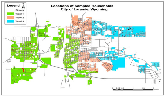Altogether, 180 residents, 60 each from three council wards of the city, were randomly selected using Excel from approximately 10,000 residential home addresses obtained from the Albany County Assessor’s office. An equal number of respondents from each ward were considered to represent the population and to maintain homogeneity and neutrality in the analysis and interpretation of the study. A mail-back survey was sent to all of the selected residential addresses (Figure 2). The response rate for the survey was 49.4%, with 89 residents taking part. Among them, 30 respondents (33.71%) represented Ward number one, 31 (34.83%) represented ward number two, and 28 respondents (31.46%) represented ward number three. The non-response rate (50.6%) may have non-response bias if some non-responders had a different view compared to those who responded; in that case, the results of the survey would have been affected. To supplement the survey results, and to highlight key stakeholders’ recycling efforts in Laramie, three key informant interviews were conducted with the City Solid Waste Manager, the University of Wyoming Recycling Manager, and the Director of Ark Regional Recycling Services, Laramie. These personal semi-structured interviews were conducted on 5 April, 9 April, and 18 April 2013, respectively, and each interview lasted for an hour. These interviews played an important role in providing in-depth information about the status of recycling in Laramie.