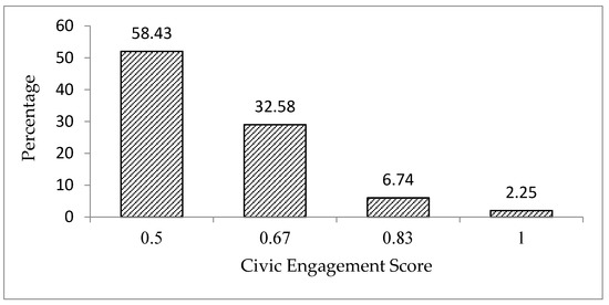 Public participation is considered a very important component in recycling programs. It includes the rigorous engagement of people from program initiation to implementation. Engagement of the public in the planning process ensures the identification and incorporation of public needs and preferences in recycling programs [40]. In the context of Laramie, to understand respondents’ level of participation and engagement, they were asked three questions: (a) Did you attend the city’s public meetings and hearings conducted? (b) Did you use public hotline to make comments about city’s recycling planning process? And (c) Did you attend any planning meetings of the city? The responses to these questions were analyzed quantitatively with (Yes = 2 and No = 1). A cumulative civic engagement score for each respondent was calculated by summing up the ordinal values corresponding to their responses and dividing by six (the highest possible ordinal value that a respondent could achieve from the three responses) to obtain the minimum score of 0.5 and maximum of 1 (Figure 3).