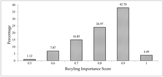 The results of the analysis showed that more than 74.16% of the respondents received high scores of 0.8 and above (Figure 8). Most of the respondents gave high-recycling importance scores, as indicated by the fact that 86 out 89 (97%) expressed recycling as an important method to waste management, and only three residents (3%) had a neutral opinion to it (Figure 9). Scott [19] observed similar results in Ontario, Canada, where residents perceived recycling as an important method to address the issue of solid waste management in their community.