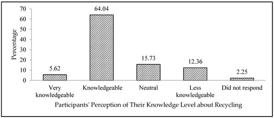 The second most noticeable reason for joining recycling programs for 59 out of 89 (66.29%) respondents was the convenience of city’s curbside recycling program (Figure 7). Here, the convenience includes the ease of managing household waste. The third most important motivation for engaging in recycling, which was expressed by 41 respondents (46.07%), was to support the city’s initiative since the program was in place. Economic affordability was important for 22 (24.72%) respondents. Only five (5.62%) respondents reported they were influenced by family and friends to participate in recycling. This number is low compared to the results of the survey done by Custom Research North America in 2011, in which 26% of the respondents were motivated by family, friends, and neighbors to join recycling efforts in their communities [45]. Seventeen respondents (19.10%) stated that other reasons, such as a mandatory fee in their utility bill and the charitable nature of non-profits, motivated them to join recycling (Figure 7).
